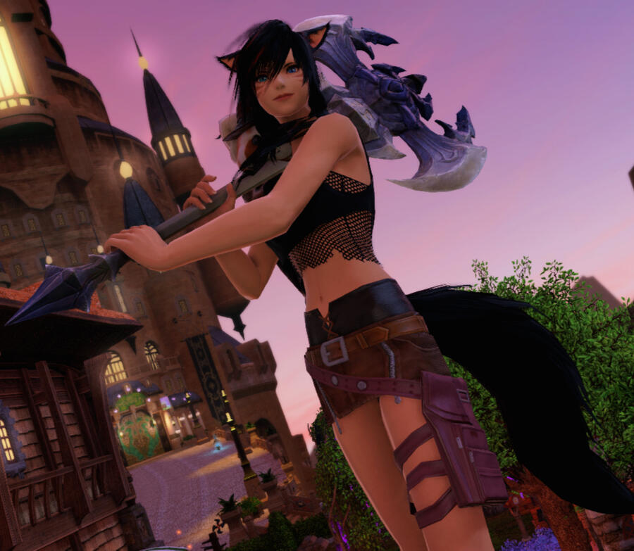 The family found refuge in the pirate town of Limsa Lominsa, changed their names and was known as the Storm family for several more years. The family was happy for once in their lives and Asuna finally got to see her father with no need for secrecy. Although the father normally taught her sister how to hunt, Asuna's mother would be in the kitchen, teaching the young Miqo'te how to cook and make her famous apple cider along with being taught by her mother magic. Asuna learnt this swiftly as her powerful attunement to aether. Asuna then grew up into a young teenager with a happy life until the parents were called to action. The sisters did not like this, while her sister protested, Asuna was too distressed to say anything until her sister ran for their parents prompting Asuna to chase after the reckless girl. The Battle of Carteneu was a fierce battle which the two sisters found themselves in the middle of. They finally found their parents but the parents were killed trying to protect the little naive girls from being harmed. Asuna ran from this and hid behind a nearby broken magitek armor. She looked up into the dreadful sky and was horrified by the great wyrm Bahamut. After a short while, she was blinded by light and suddenly found herself in the woods of the Black Shroud, alone and lost.